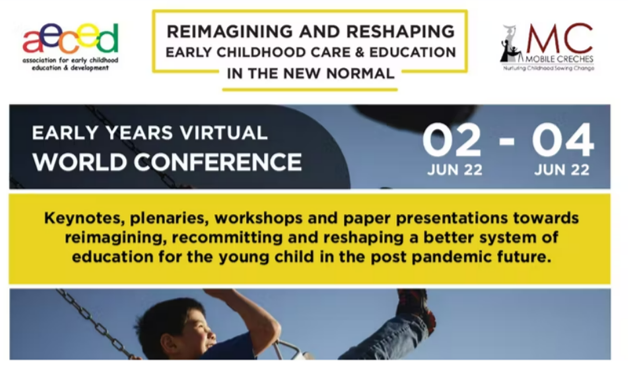 Association for Early Childhood Education & Development (AECED), in collaboration with Mobile Creches, will be organsing the Early Years Virtual World Conference from 2 to 4 June 2022. The theme is on ” REIMAGINING & RESHAPING Early Childhood Care and Education for the NEW NORMAL”