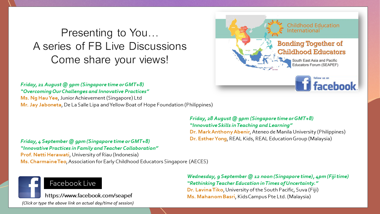Childhood Education International (CEI), together with South East Asia and Pacific Educators Forum (SEAPEF) are pleased to invite you to join them for a series of Facebook Live Forum Sessions on “New Skills for Life”.